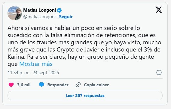Pero lo que llamó la atención en el comunicado de la ayuda financiera fue el pedido de Bessent de que Argentina vuelva a restaurar las retenciones.