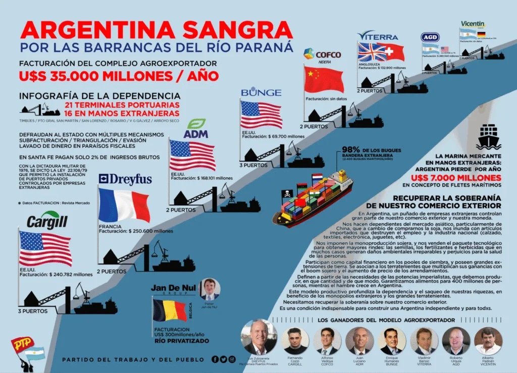 Esta estafa es posible por como esta organizado el comercio exterior en nuestro país que lejos de ser argentino hoy esta dominado por un grupo recudido de multinacionales principalmente estadounidenses pero también europeas y chinas.