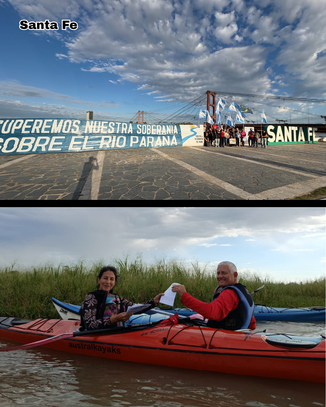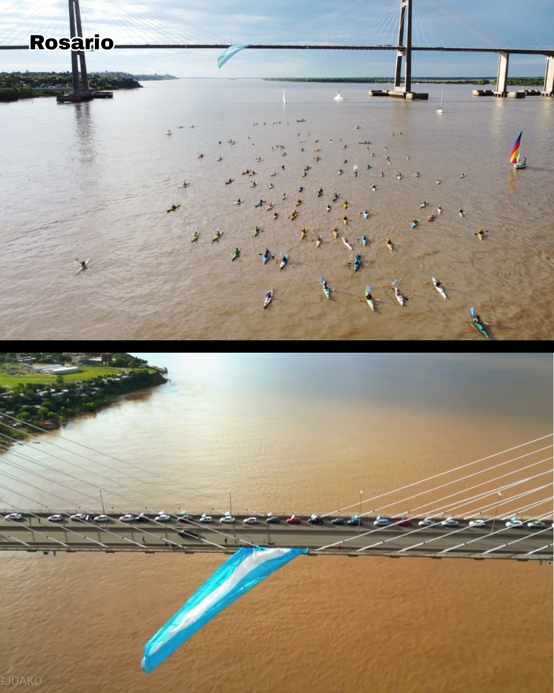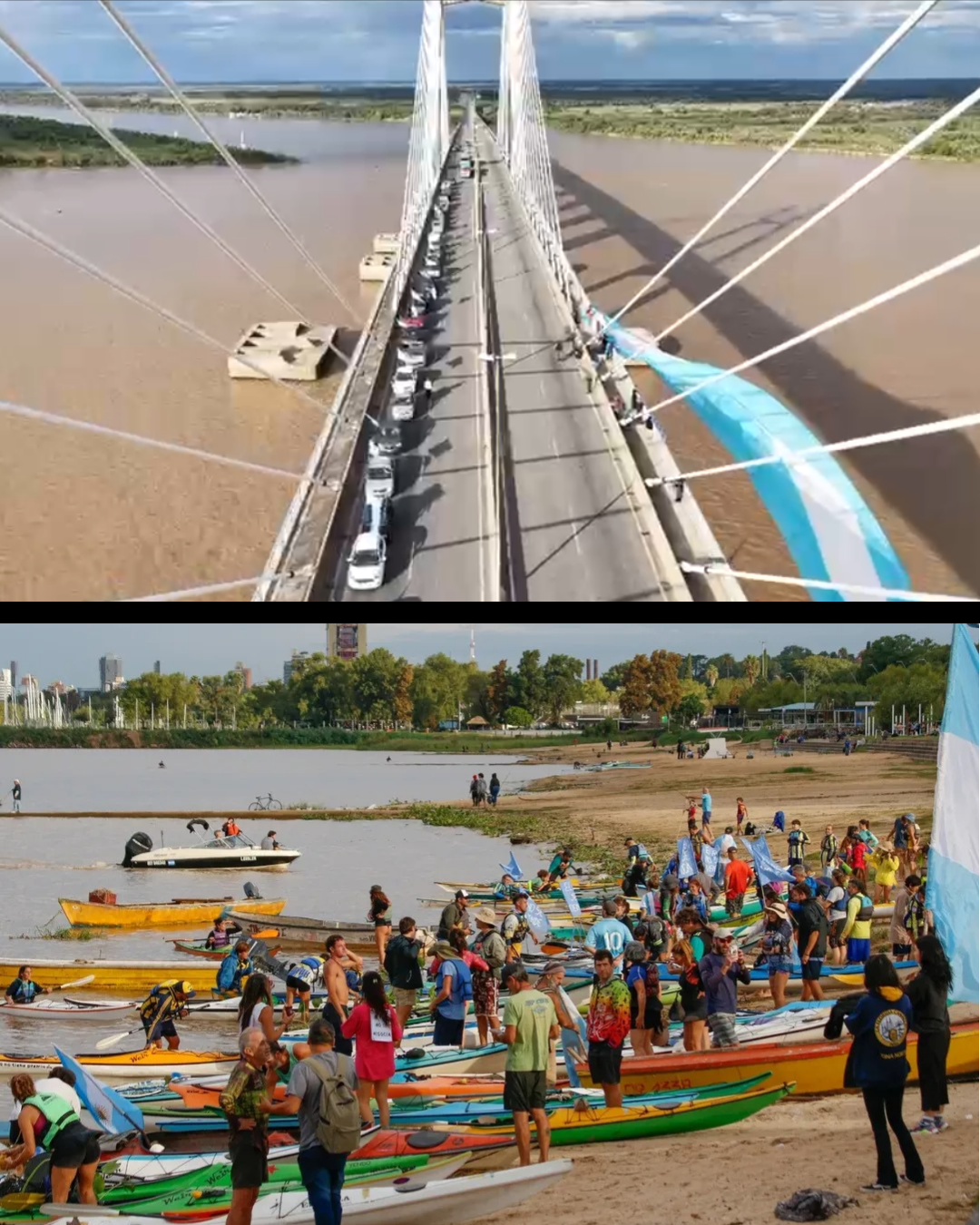 En nuestra región, un desfile de embarcaciones y kayaks portando banderas argentinas con sus consignas se concentró pasado el mediodía en la Isla de Los Mástiles, para cruzar “por agua” el río y dirigirse a la Rambla Catalunya de la ciudad de Rosario, empalmando con el recorrido “por tierra” de una gran caravana de vehículos, también embanderados, en el cruce del puente Rosario -Victoria, que desplegó desde su altura y a su paso una inmensa bandera argentina, unidos en sus cánticos por un estridente y patriótico reclamo: “¡No se vende! ¡El río no se vende! ¡El río se defiende!”