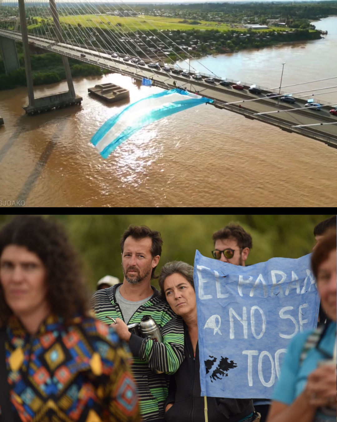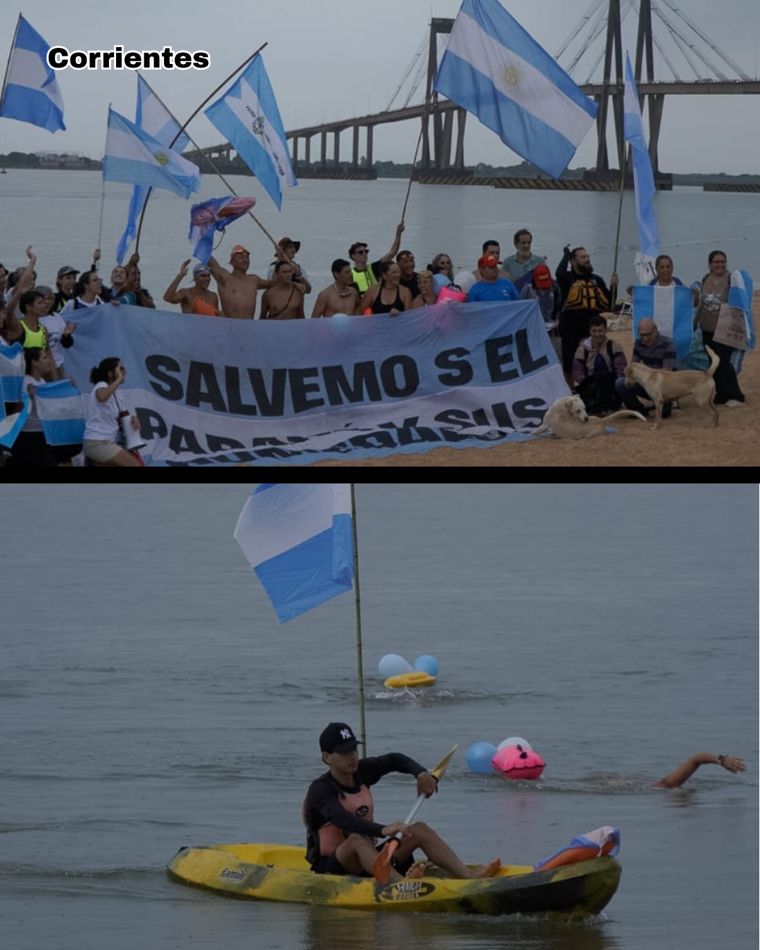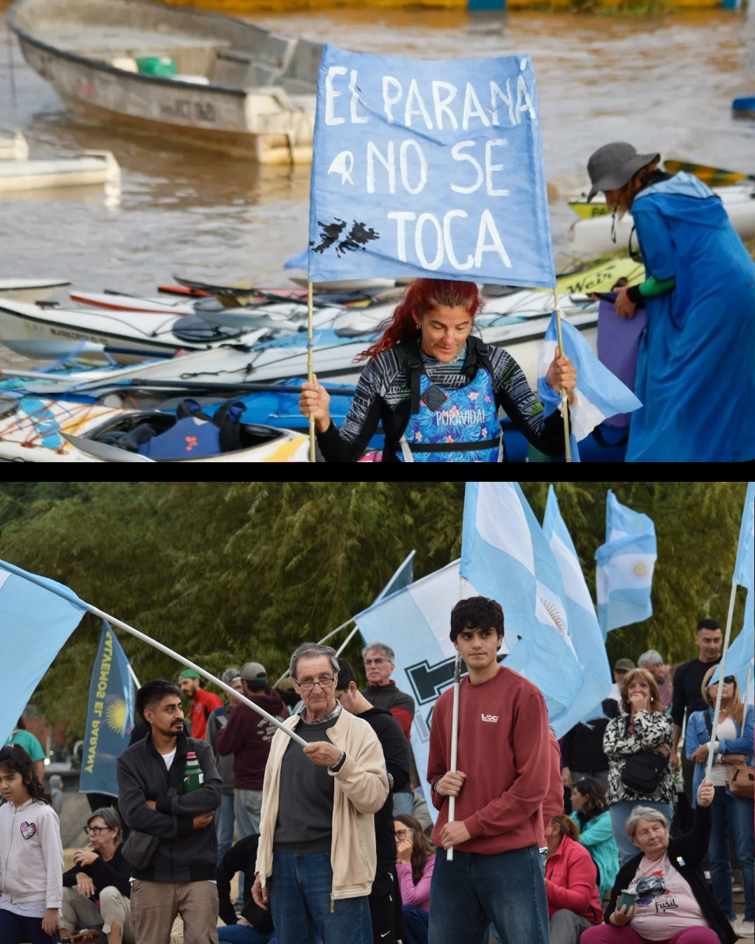 En nuestra región, un desfile de embarcaciones y kayaks portando banderas argentinas con sus consignas se concentró pasado el mediodía en la Isla de Los Mástiles, para cruzar “por agua” el río y dirigirse a la Rambla Catalunya de la ciudad de Rosario, empalmando con el recorrido “por tierra” de una gran caravana de vehículos, también embanderados, en el cruce del puente Rosario -Victoria, que desplegó desde su altura y a su paso una inmensa bandera argentina, unidos en sus cánticos por un estridente y patriótico reclamo: “¡No se vende! ¡El río no se vende! ¡El río se defiende!”